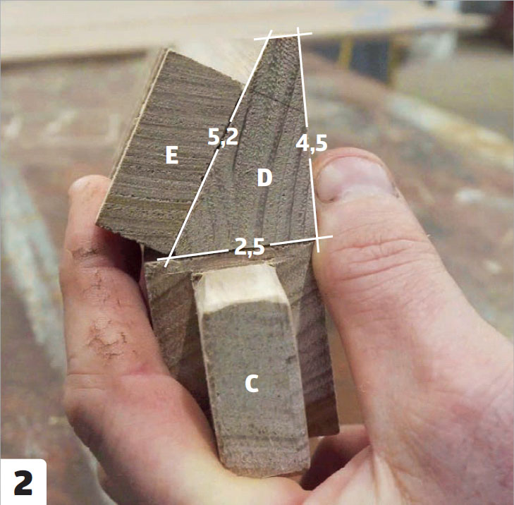 Den tredje tvärgående ribban (D) ska sågas till med en trekantig profil som möter ryggstödet i vinkel, och slutligen ska tre distansribbor (E) läggas ovanpå de tvärgående ribborna och fixera rygg och sits.