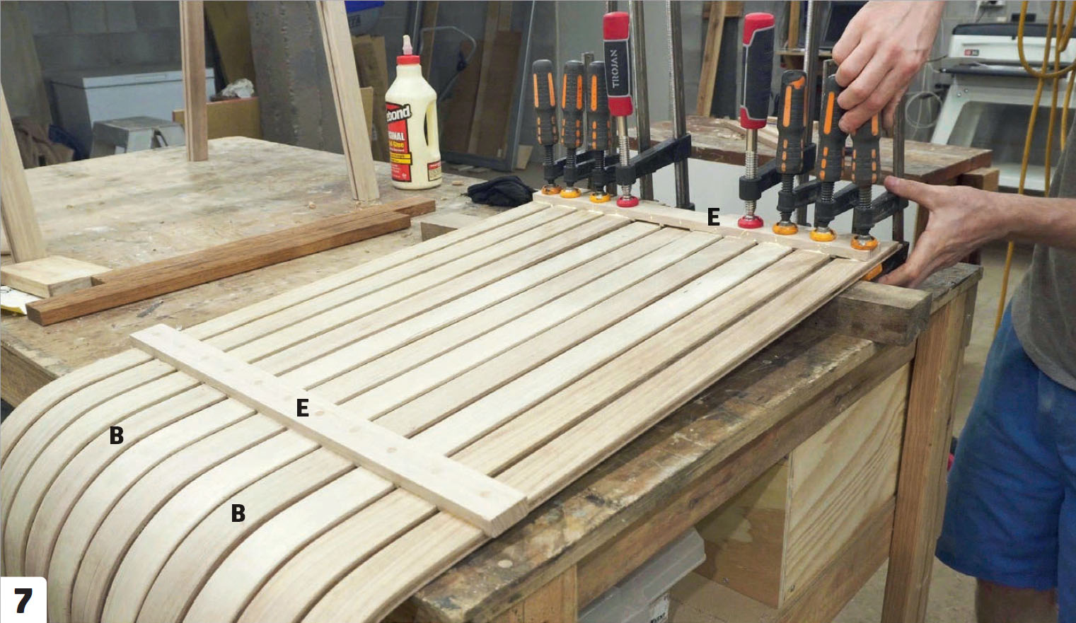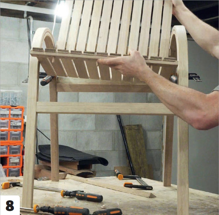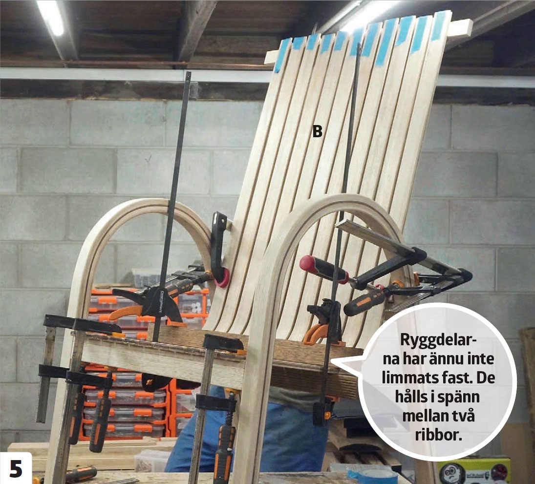 Ånga och böj rygg- och sitsribborna tre åt gången. När du spänner fast rygg- och sitsdelarna (B) i formen, ska du börja vid den korta änden. De tre ribborna ska härda över natten och sedan limmas ihop.