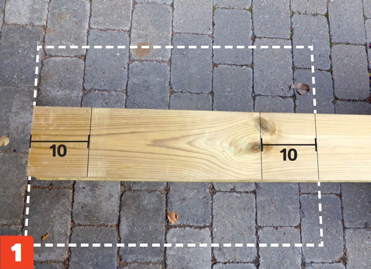 Rita två vinkelräta streck 10 cm in på den första brädan, mätt från varje kant på plattan (visas med streckade linjer). Dra även streck på baksidan. Markera den andra änden av brädan på samma sätt.