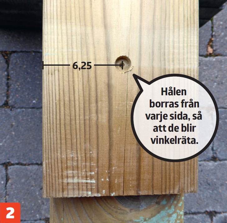 Mät in till mitten vid alla fyra streck. Borra halvt igenom med ett 12 mm träborr. Vänd brädan, mät mitten igen, och borra resten. Använd sedan den första brädan som borrmall, när du borrar de andra fyra brädorna.