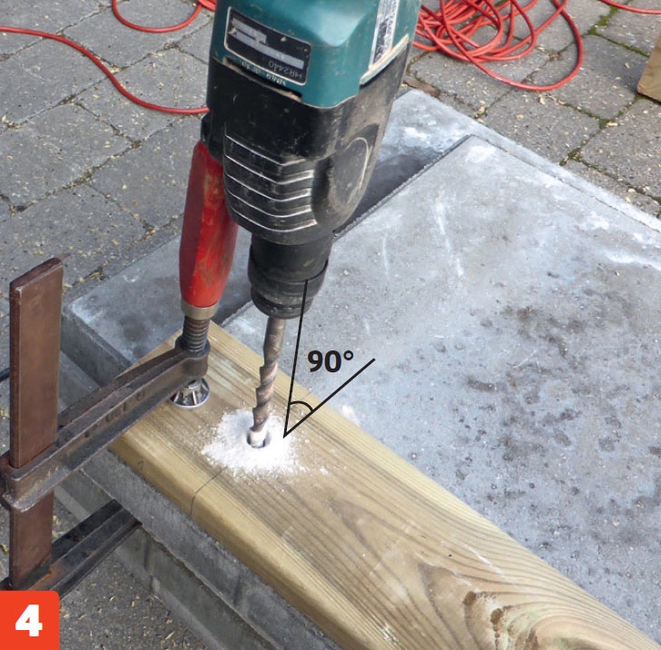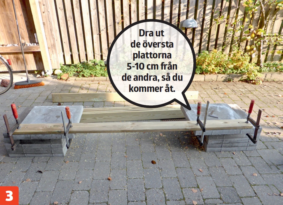 Lägg plattorna i två högar. Spänn fast borrmallen (den första brädan) till de övriga plattorna, och se till att den går i linje med plattornas ovan- och bakkanter. Borra med ett 12 mm betongborr i en platta åt gången.