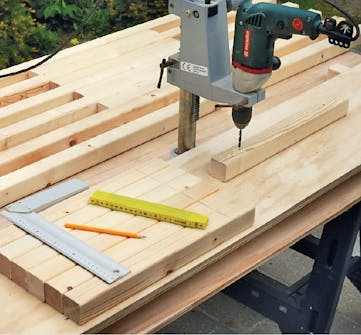 Börja med att kapa alla 45 x 45 mm reglar till rätt längd, se materiallistan. Räkna därefter ut var de ska skruvas ihop och förborra för skruvarna med 4,5 mm borr. Här har du nytta av borrstativ, men det går att borra på fri hand.