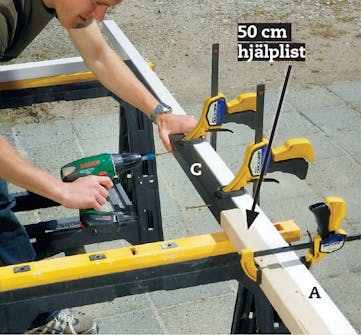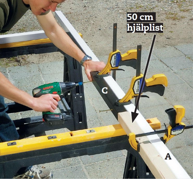 Skruva fast de första mellanbitarna (C) på den främre sitslisten (A) 50 cm från kortändarna på (A). För att underlätta arbetet använder vi en 50 cm lång regelstump.