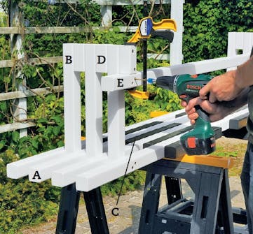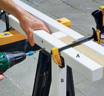 Benen (B) fästs 25 in från kortändarna på sitslisterna (A). Även här underlättar en hjälplist, men den ska förstås bara vara 25 cm lång. Till varje ben och andra fogar används två 4,8 x 75 mm trallskruvar i de diagonalt placerade hålen.