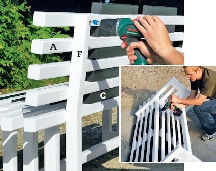 För att slippa synliga skruvhål börjar du ihopsättningen framifrån, alltså med den främre sitlisten. Nästa list fästs bakom den första och skruvarna dras i bakifrån. Då täcks varje skruvrad av den senast monterade sitt- eller rygglisten. Du kan se några av hålen från baksidan, men där spacklas de igen och målas över så att de inte syns.