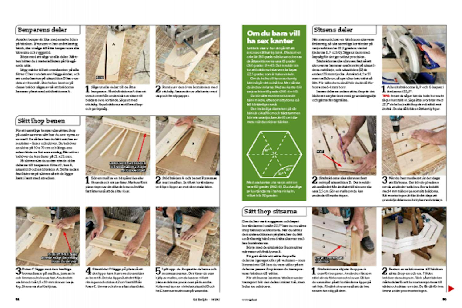 När man snickrar en bänk som ska vara åttkantig, så ska samtliga kortändar på varje sektion ha 22,5 graders vinkel (delarna E, F och G). Såga ut dem med kapsåg för det ger störst precision.