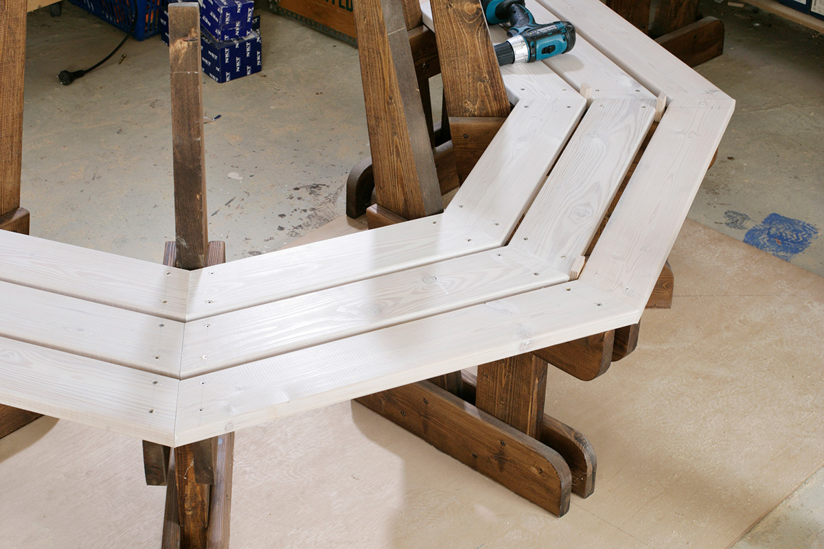 Om du har varit noggrann och kapat kortändarna i exakt 22,5° kan du nu sätta ihop bänken sektionsvis. När du sätter den sista sektionen på plats har du fått en åttkantig bänk med täta skarvar mellan kortändarna.