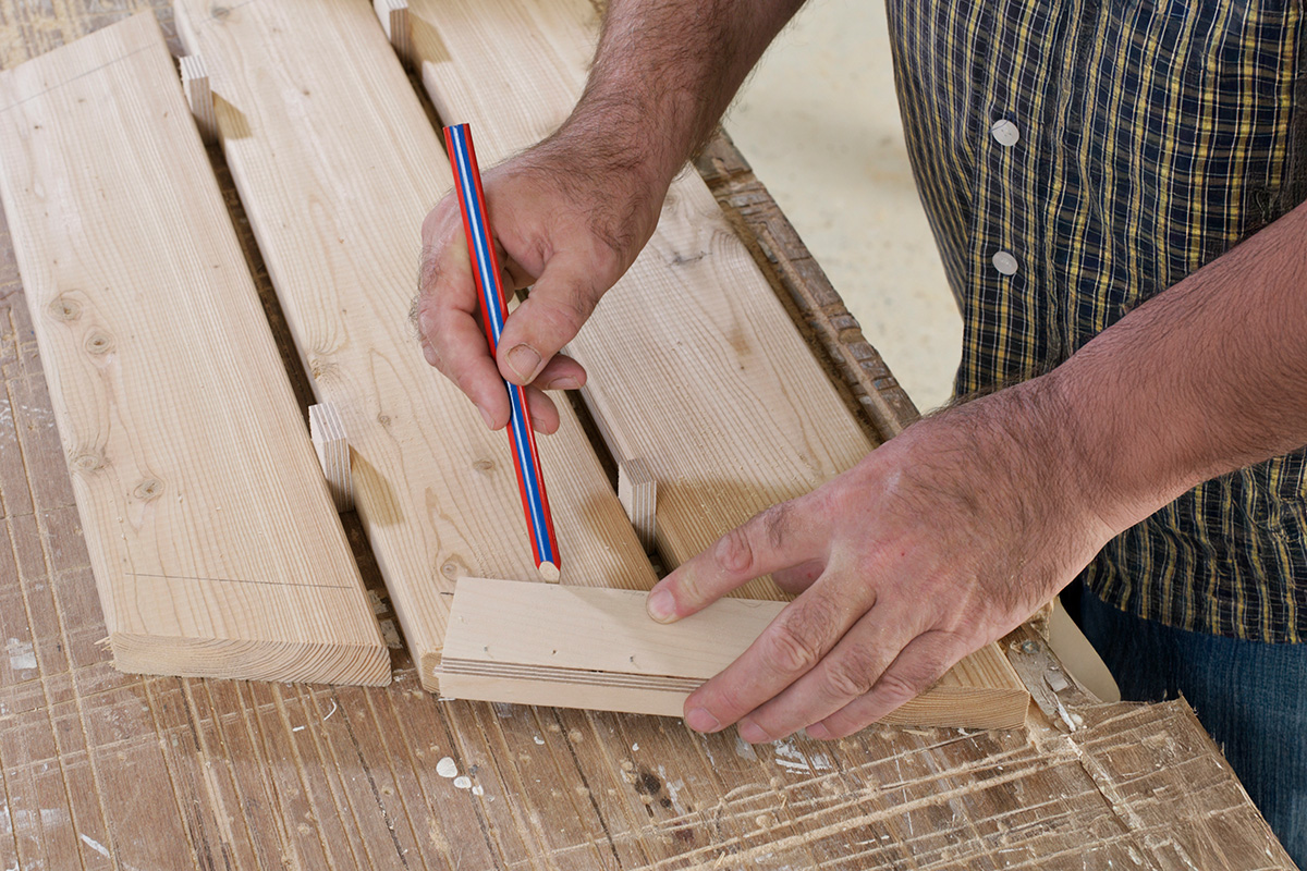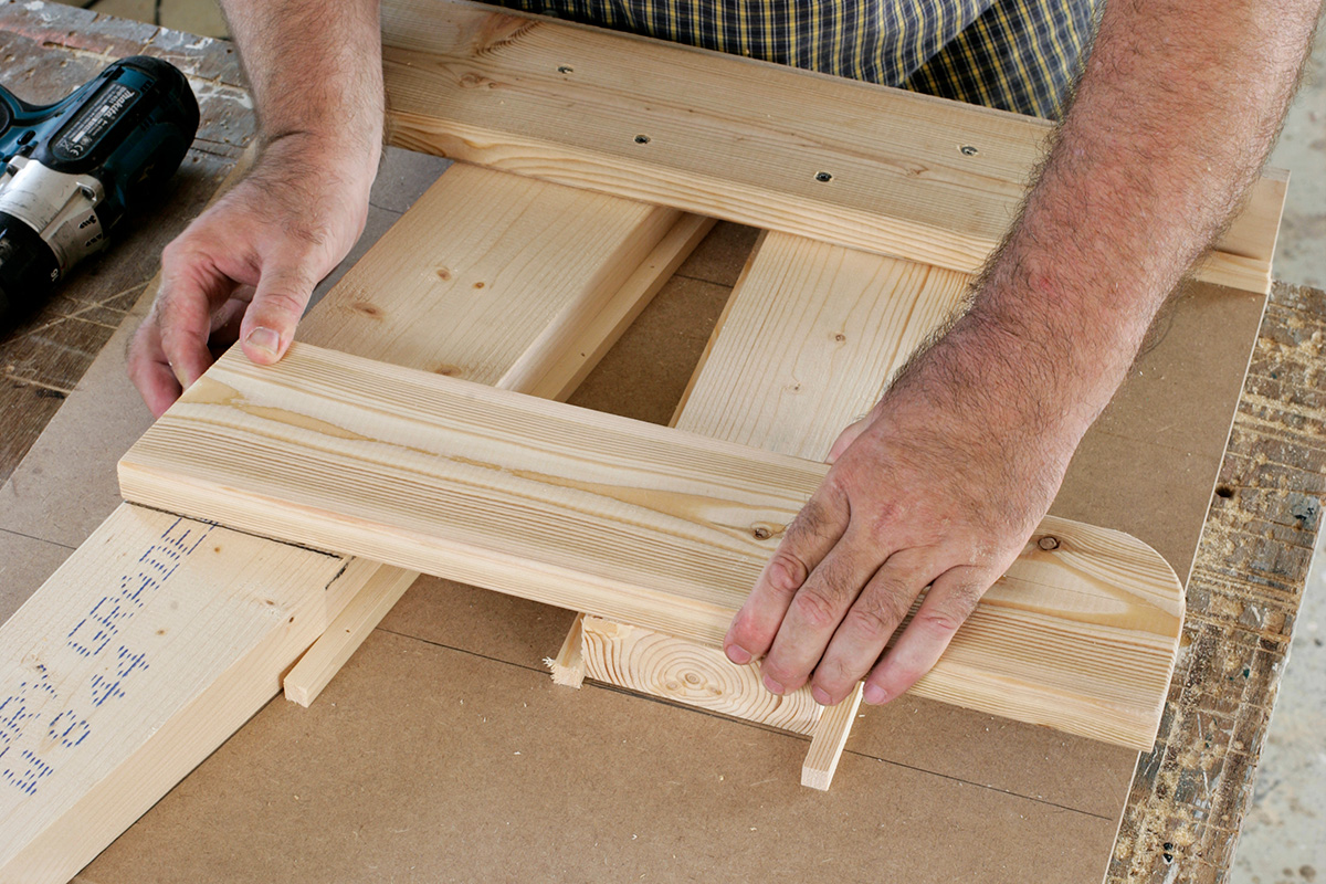 Sitsbrädorna skjuts ihop precis ovanför benparen. Använd en list som stöd när du förborrar och skruvar. Då kan du vara säker på att kortändarna ligger på rak linje. Försänk skruvarna så att du inte senare river dig på dem.
