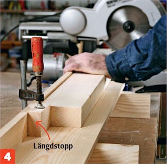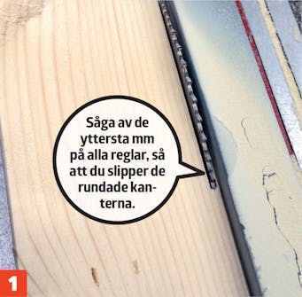 Reglarnas kanter är rundade. Vi har skalat av det yttersta lagret med bordcir-kelsågen, så att vi får helt skarpa linjer. Vi sågar av 5 mm på varje regel.