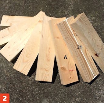 Vi rekommenderar att du använder en bordcirkelsåg till uppgiften. Sedan sågas reglarna till i rätt längder. Till bänken vi bygger här används fyra olika längder: ben på 31 och 40 cm och sits-reglar på 82 och 100 cm.