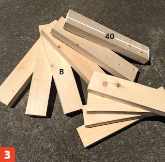 De långa benen (B) sågas till. 10 reglar ska sågas i längden 40 cm. Det är den andra halvan av bänkens ben.