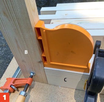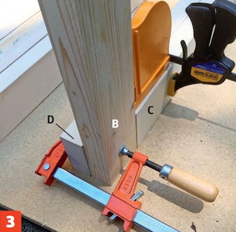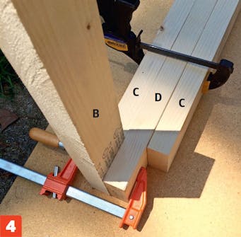 Kort (B) och lång (C) passas ihop. Stryk lim på ytorna på en sitsregel (C) och ett långt ben (B). Sätt träet under press med skruvtvingar.