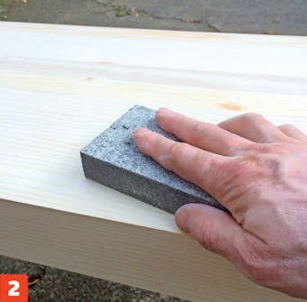 Bänken kan slipas med en bandslip. Men pass på! Bandslipen kan gräva sig ned i träet. Öva på en bit restträ innan du går loss på bänken. Alternativt kan du använda excenterslip eller elhyvel.