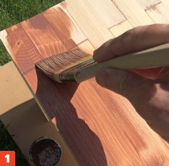 Vi målar bänken med en mörk, semitransparent olja. Applicera oljan eller träskyddet med pensel eller roller.