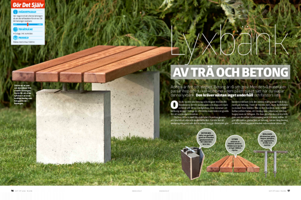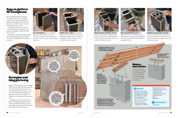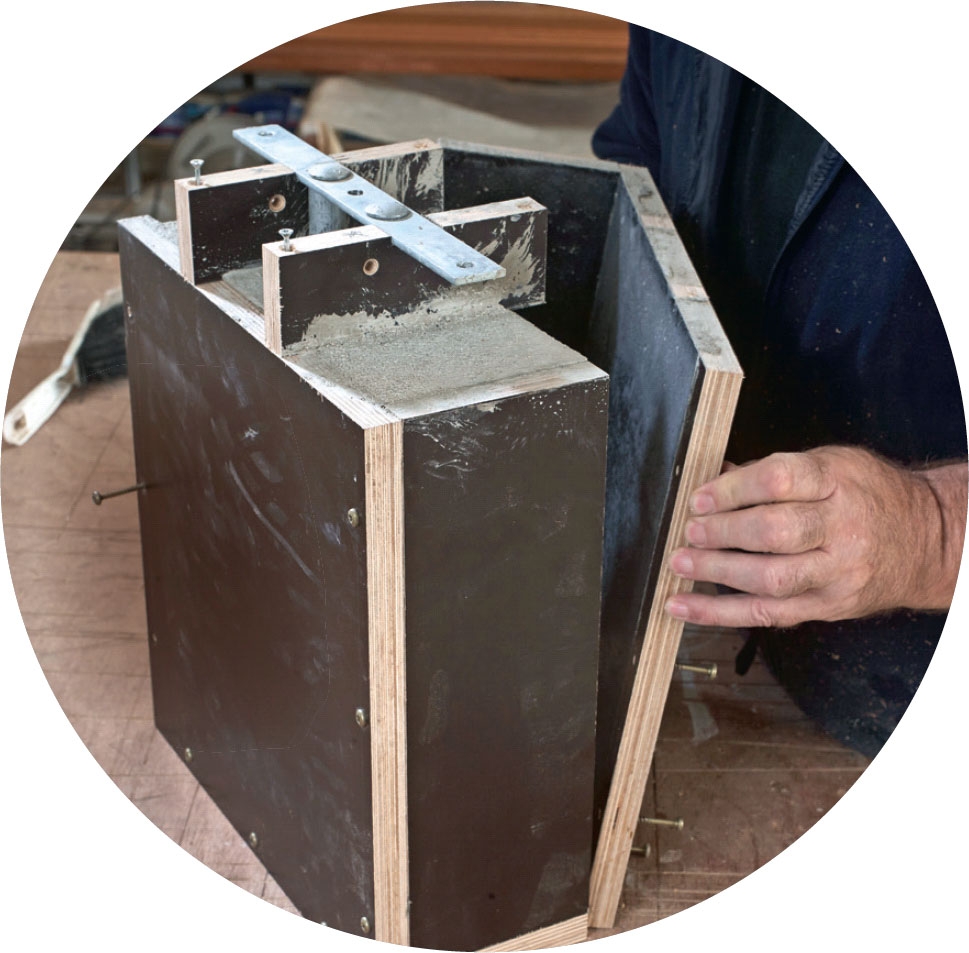 Benen till bänken gjuts av betong och därför börjar vi med att snickra en gjutform av 20 mm gjutplywood. Formens invändiga mått ska vara 12 x 30 x 35 cm och förses med en botten. Då blir benen raka och fina.