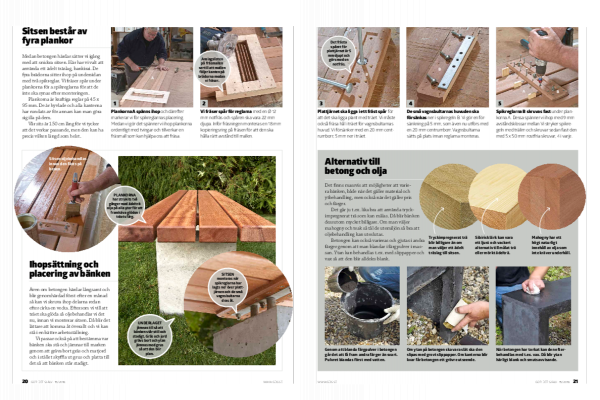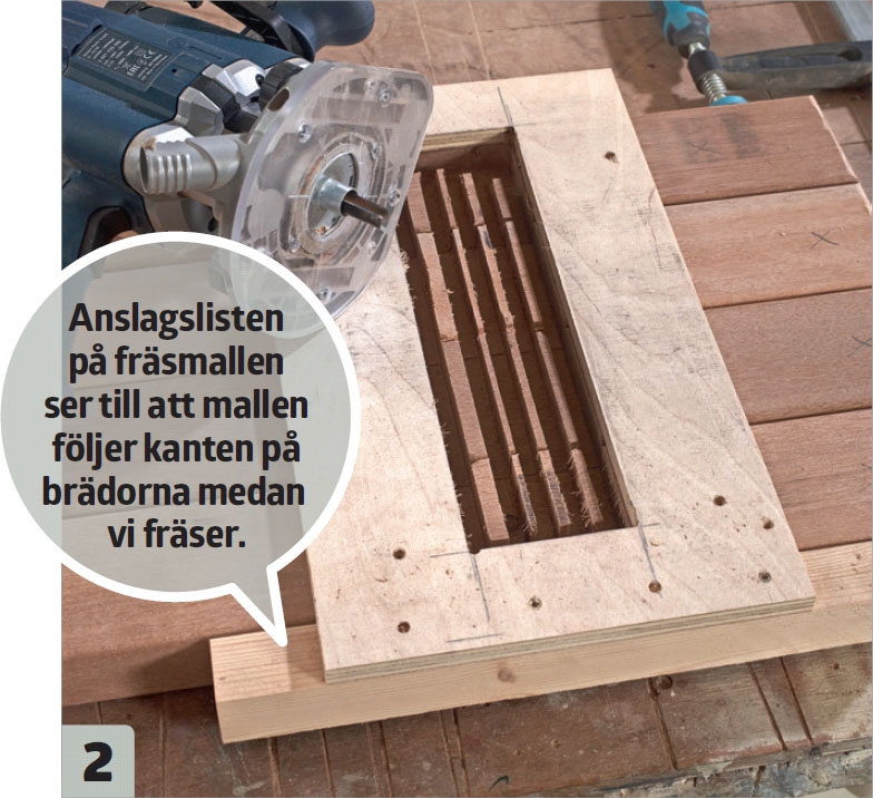 Medan betongen härdar sätter vi igång med att snickra sitsen. Här har vi valt att använda ett ädelt träslag, bankirai. De fyra brädorna sitter ihop på undersidan med två spikreglar. Vi fräser spår under plankorna för a spikreglarna för att de inte ska synas efter monteringen.