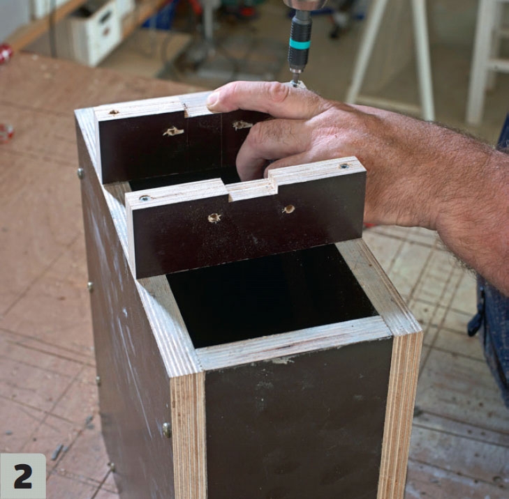 Skruva ihop delarna när du har sågat till plywooden. Här använder vi 5 x 50 mm skruvar som placeras så att vi lätt kan komma åt dem när de ska lossas och det färdiga benet tas ut.