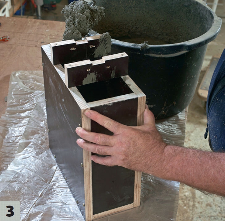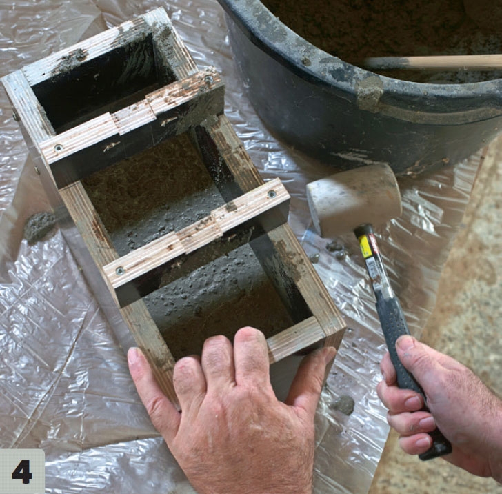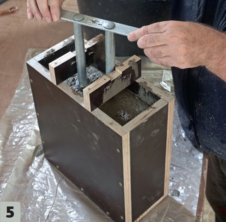Blanda betongen och häll den i formen. Massan ska vara relativt tunnflytande för att komma ut i alla hörn. Medan blandningen hälls i fördelar och vibrerar vi dem med en list för att fylla formen helt.