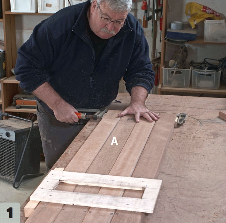Plankorna A spänns ihop och därefter markerar vi för spikreglarnas placering. Medan vi gör det spänner vi ihop plankorna ordentligt med tvingar och tillverkar en fräsmall som kan hjälpa oss att fräsa.