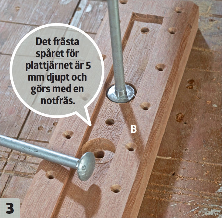 Plattjärnet ska ligga i ett fräst spår för att det ska ligga plant med träet. Vi måste också fräsa hål i träet för vagnsbultarnas huvud. Vi försänker med en 20 mm centrumborr, 5 mm ner i träet.