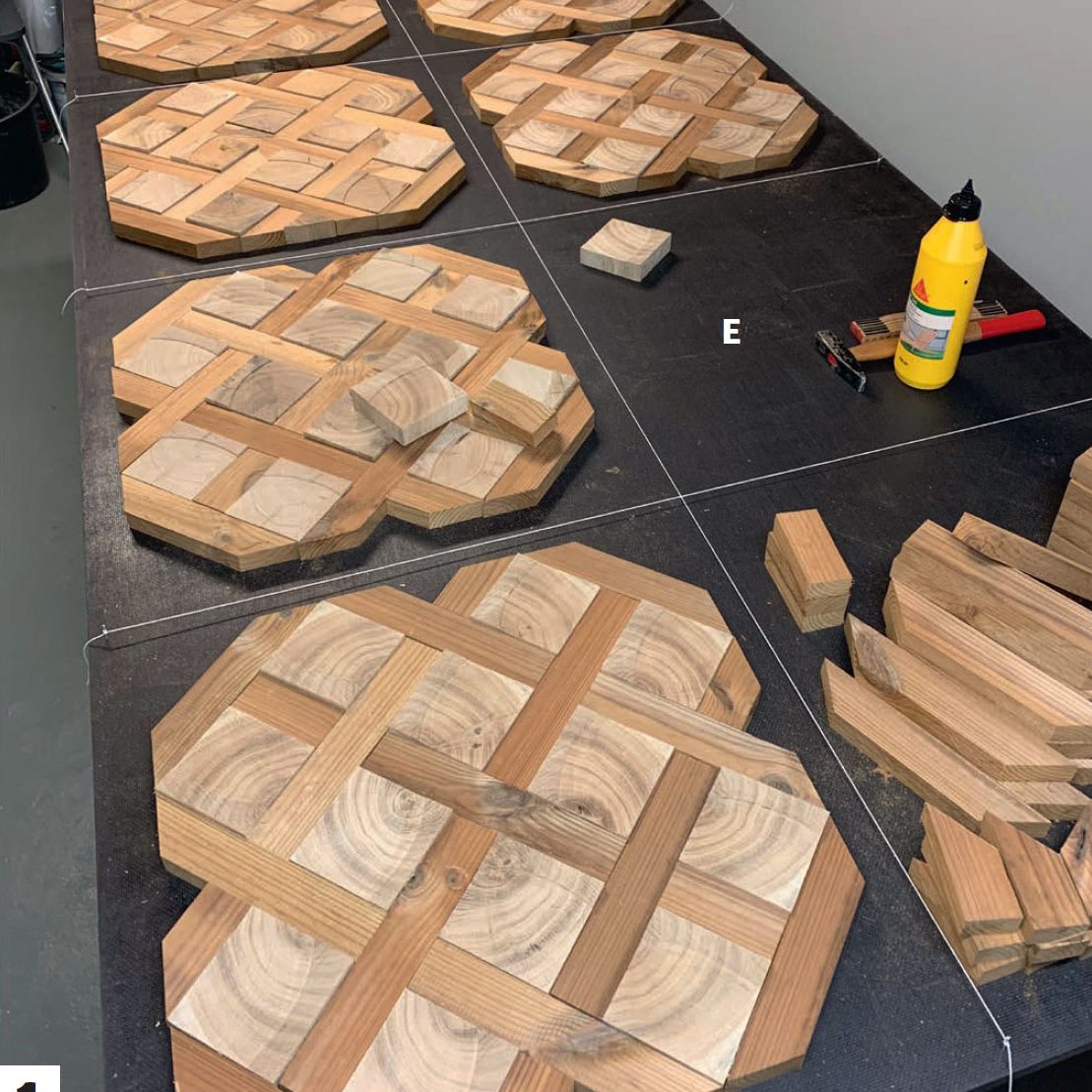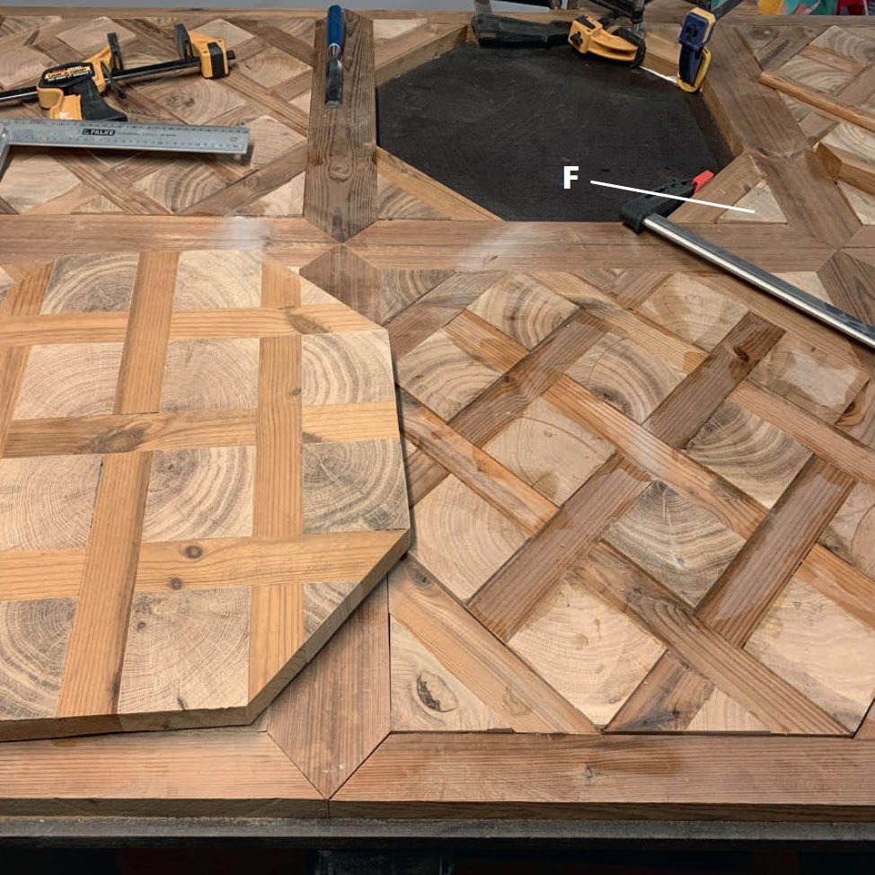 3. Börja med att lägga den mellersta linjen när du limmar fast mönstret på skivan. Därefter kan du bygga vidare på mönstret. De trekantiga klossarna (F) i hörnen kan du dock vänta med till sist. När du limmar är det viktigt att trycka ihop allt ordentligt med skruvtvingar så att fogarna blir helt täta.