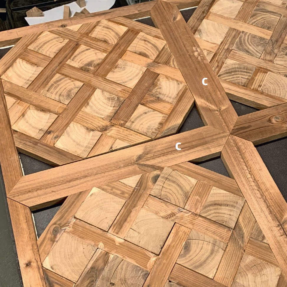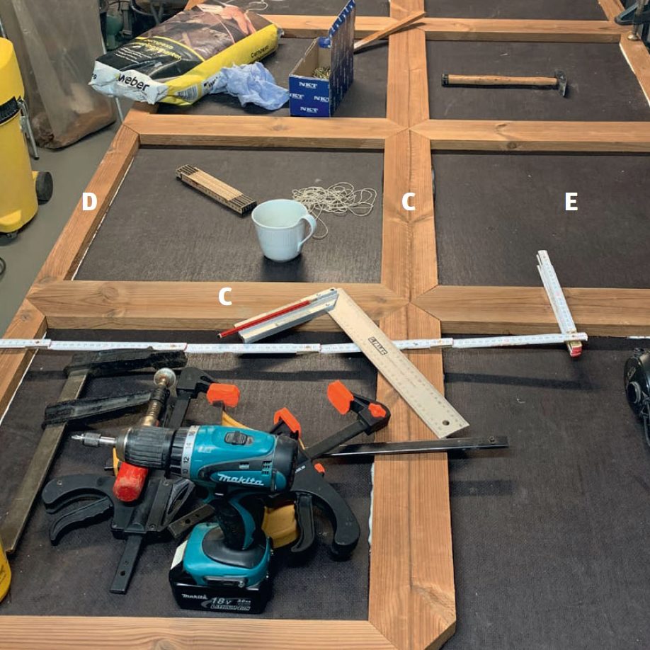 2. De 8 fälten är åtskilda av 10 mellanbitar (C) på 10 cm, som har sågats snett i båda ändarna. Till ramen (D), som ramar in det hela, används en 5 cm bred list som kapas i jämnhöjd med mellanbitarna.