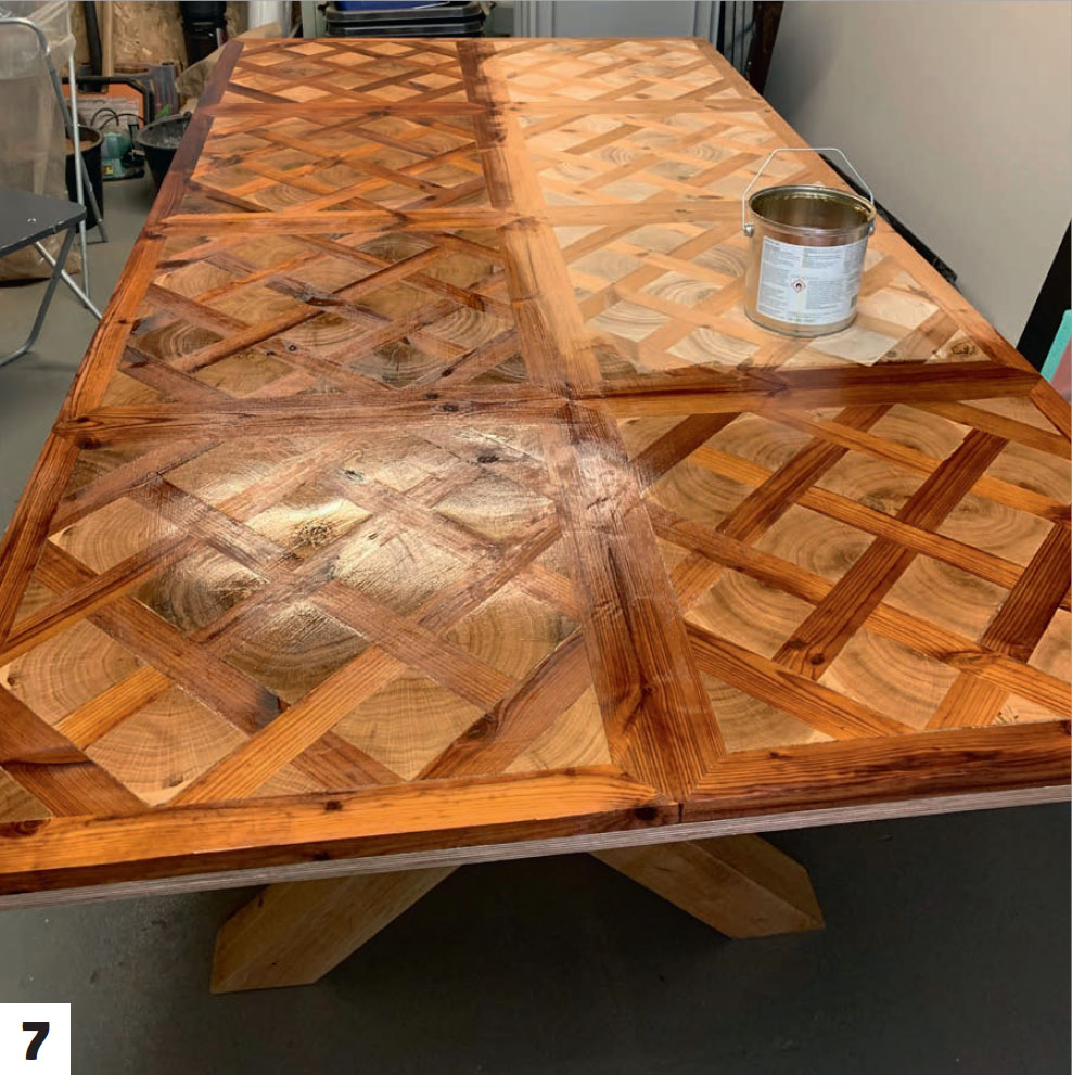 2. Bänkskivan består av 8 fält på 60 x 60 cm. Börja med att limma ihop en sektion för varje fält innan du limmar dem på den vattenfasta plywoodskivan som utgör underlaget.