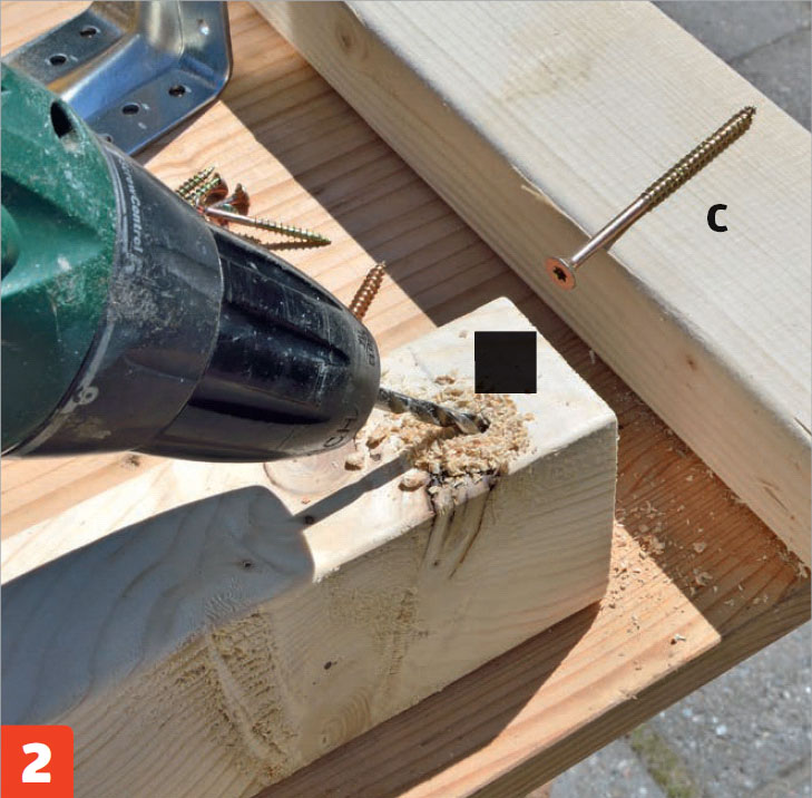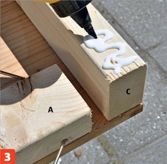 När vi har sågat till alla delarna ska underredets två sidor sättas ihop. Varje sida består av två ben (C) och en sarg (A) som sätts ihop med lim, skruv och två kraftiga vinkelbeslag.