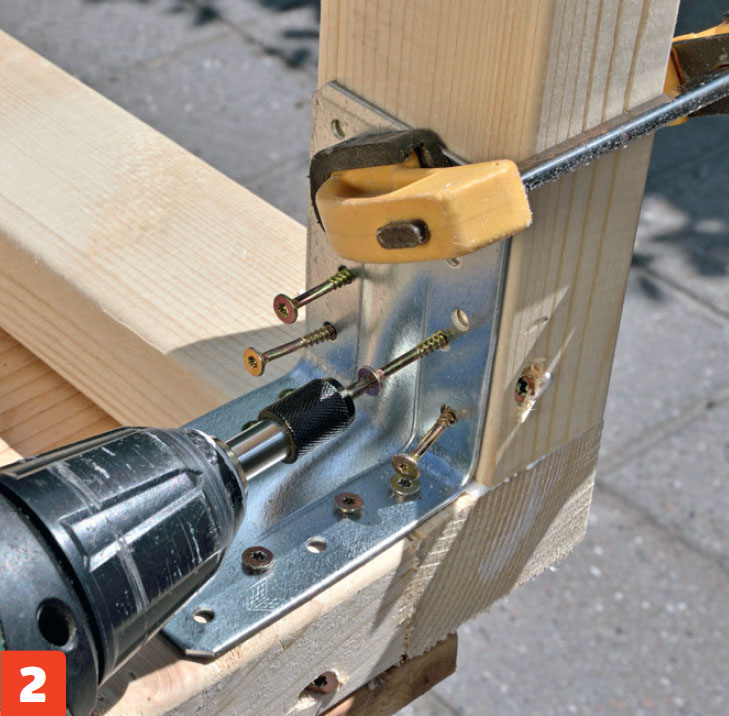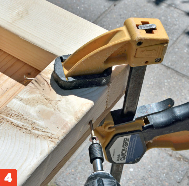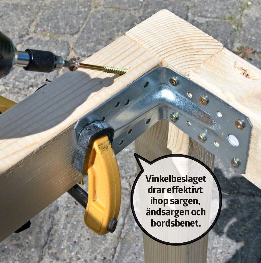 Spänn ihop delarna ordentligt med en tving tving och skruva fast sargen i benen med två 5 x 90 mm skruv i vardera ände.