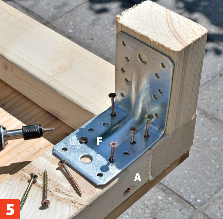 Skruva fast vinkelbeslaget (F) på sargen (A) med 4,8 x 40 mm ankarskruv. Klossen används för att hålla rätt avstånd till bordets ändar, som senare ska sättas ihop med en ändsarg i vardera ände.
