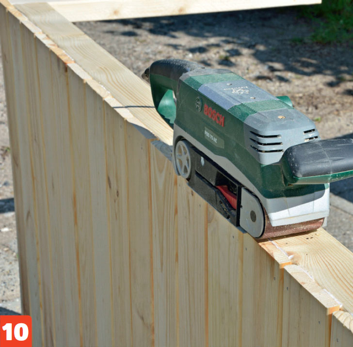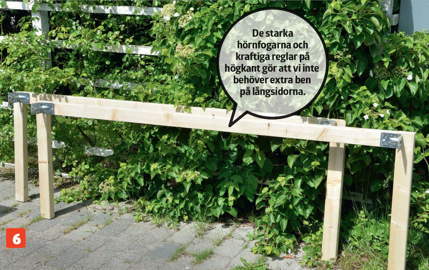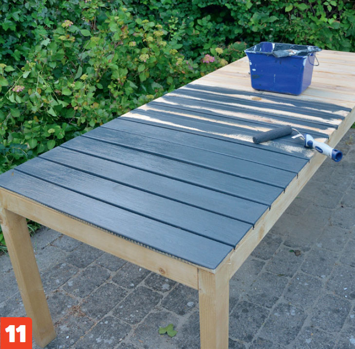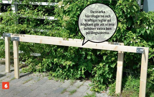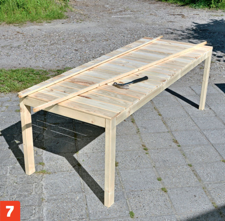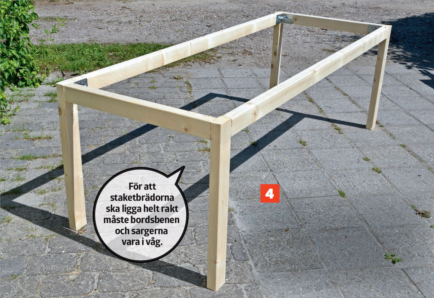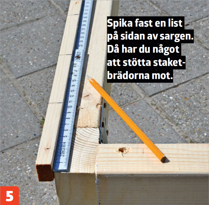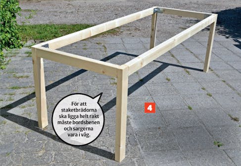 Nu är bordet så gott som färdigt och du kan försiktigt ta bort listen som du använde för att stötta staketbrädorna mot.
