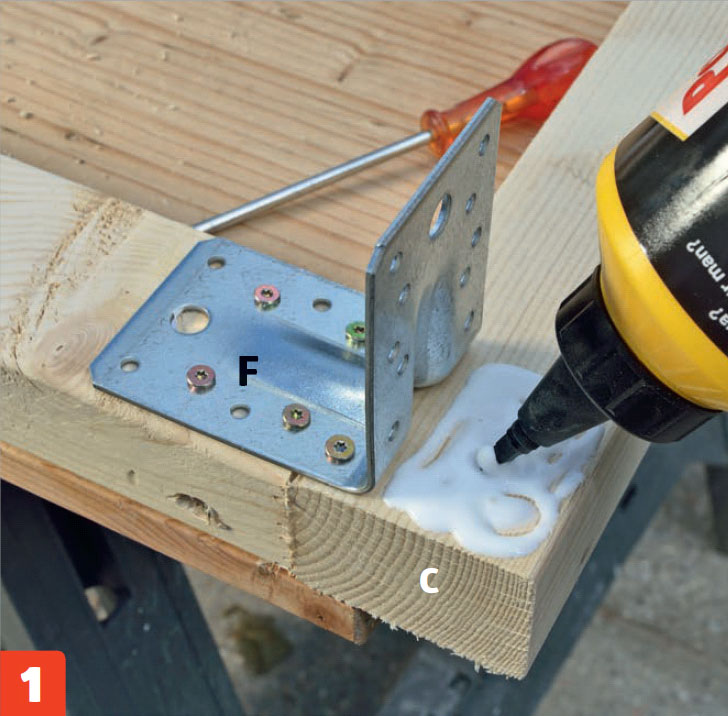 Stryk lim på benen (C). Lägg märke till att de innersta skruvarna på beslaget (F) får fäste i benen.