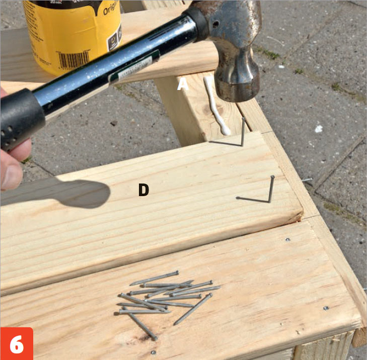 Stryk lim på sargen (A), där brädorna till bordsskivan (D) ska ligga. Spika fast brädorna med 1,8 x 40 mm galvaniserade dyckert.