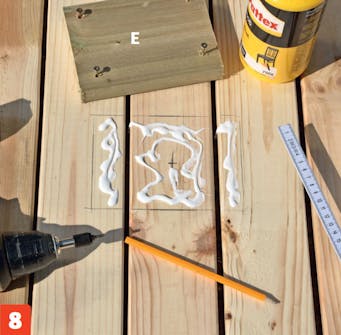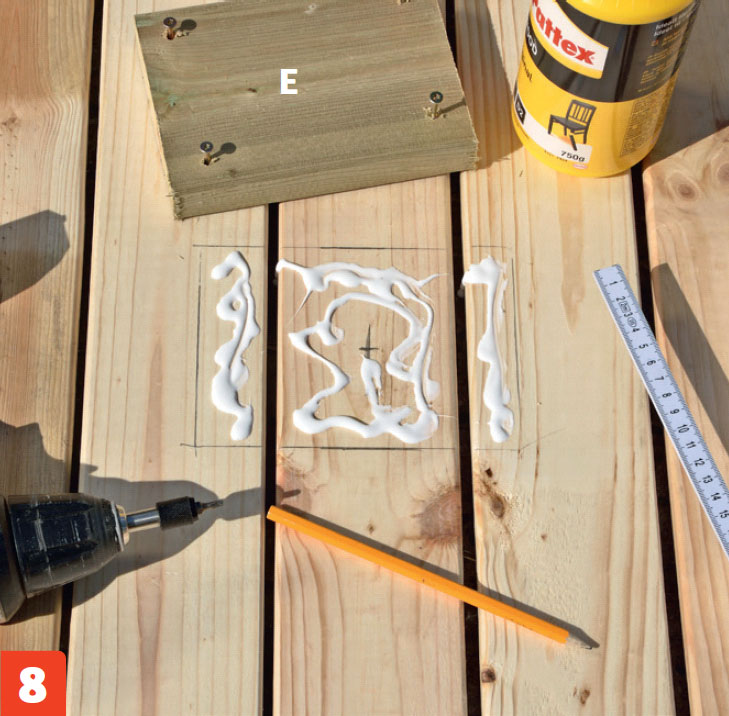 Gör ett parasollstöd genom att limma och skruva fast en kloss (E) på bordets undersida med 4 x 35 mm skruv.