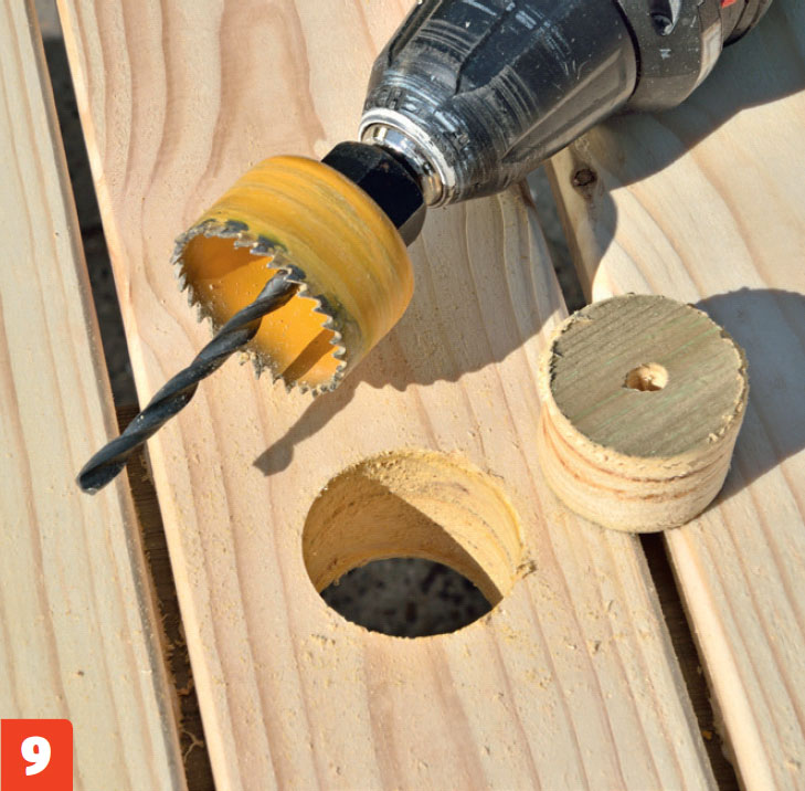 Borra hål till parasollstången uppifrån. Använd ett hålborr som passar till parasollstångens diameter och borra sedan genom bordsskivan och klossen.