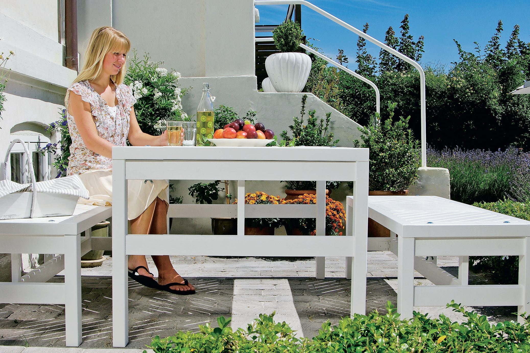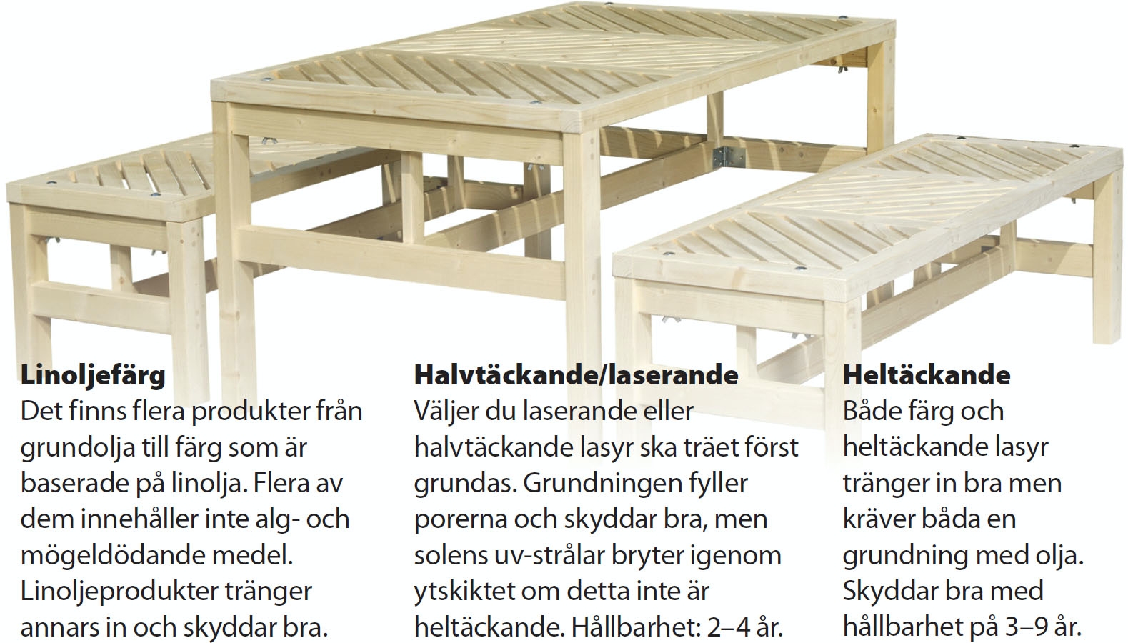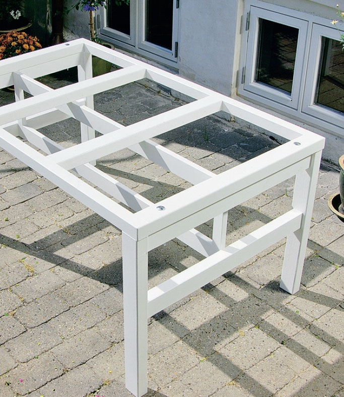Både bord och bänkar kan tillverkas i flera varianter. Måtten på ramarna gör att du kan lägga 40 x 40 mm plattor av sten i dem, i stället för att använda trälister. Stenplattor läggs löst i ramarna och lyfts bara upp när du ska sätta undan eller flytta möblerna. Det finns massvis av stenplattor att välja bland så du kan skapa ett eget och unikt utseende på möblerna.