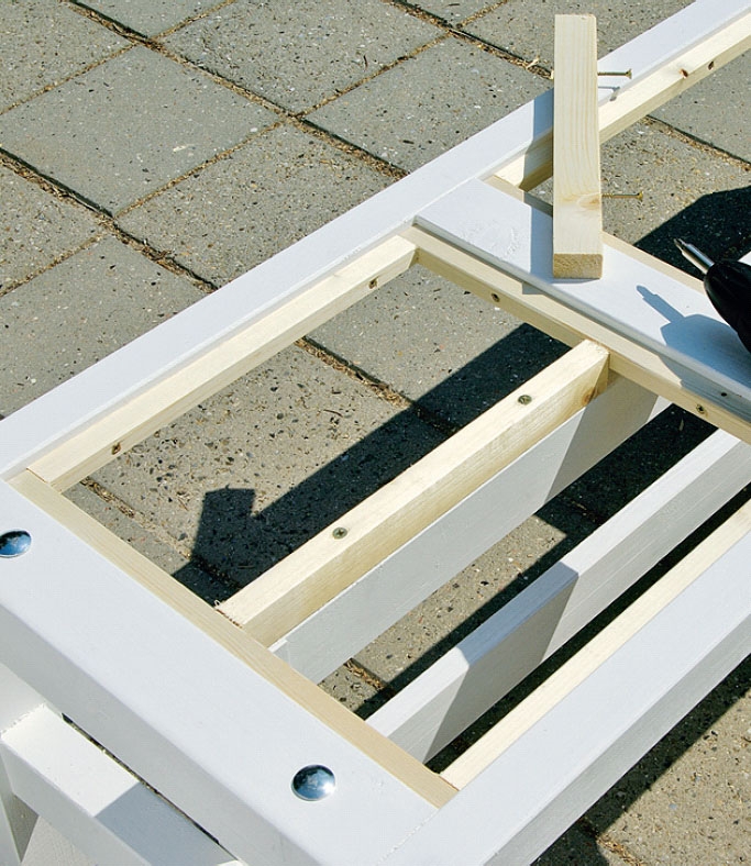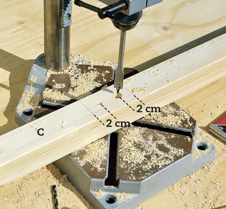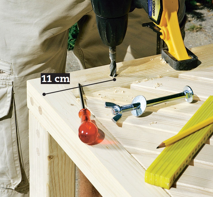 Markera på långsidorna för skruvhålen. De placeras 2 cm in från sidorna på tvärstagen. Borra först plugghålen med 12 mm centrumborr och fortsätt med 5 mm borr för skruvarna.