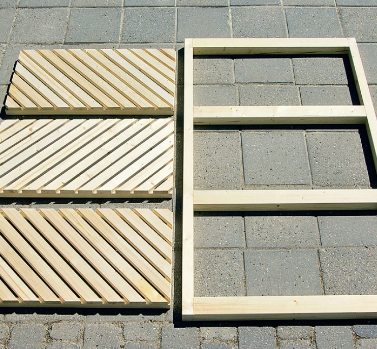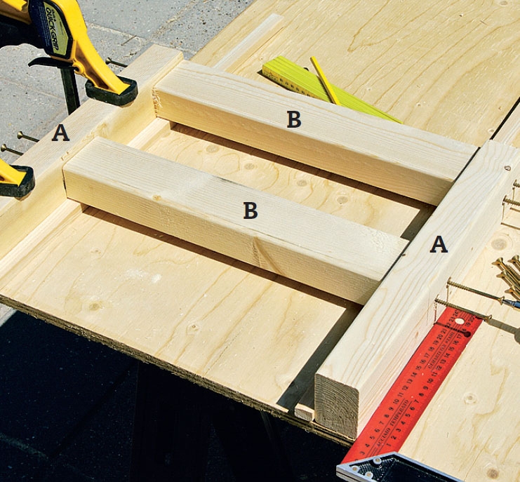 Ramarna till sitsar och bordsskiva görs av 45 mm reglar. Tvärstagen (B) är 45 x 70 mm medan långsidorna (C) är 45 x 45 mm. Lägg ut reglarna på marken och markera på långsidorna för tvärstagen.