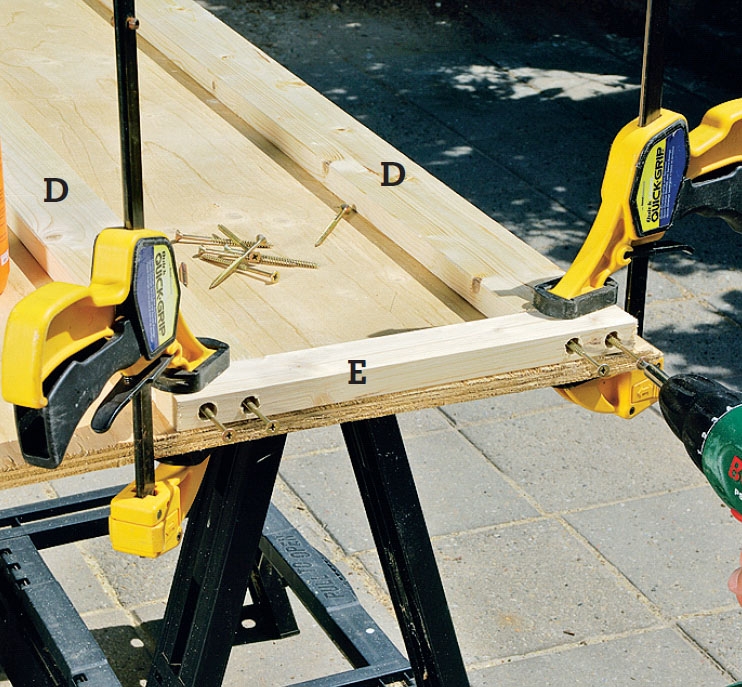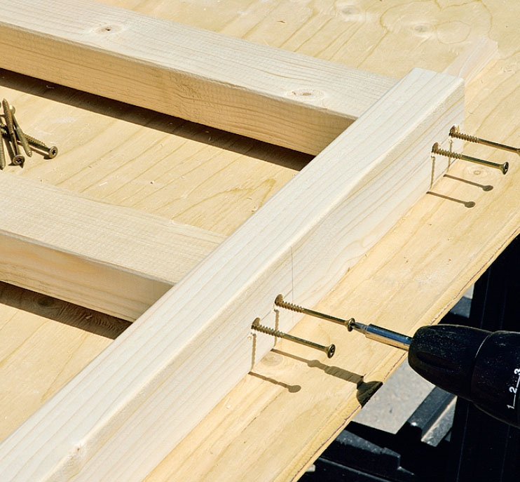 Lägg ramdelarna på en skiva med vinkelräta hörn. Spänn fast delarna med tvingar och skruva ihop ramarna med 6 x 100 mm skruvar.