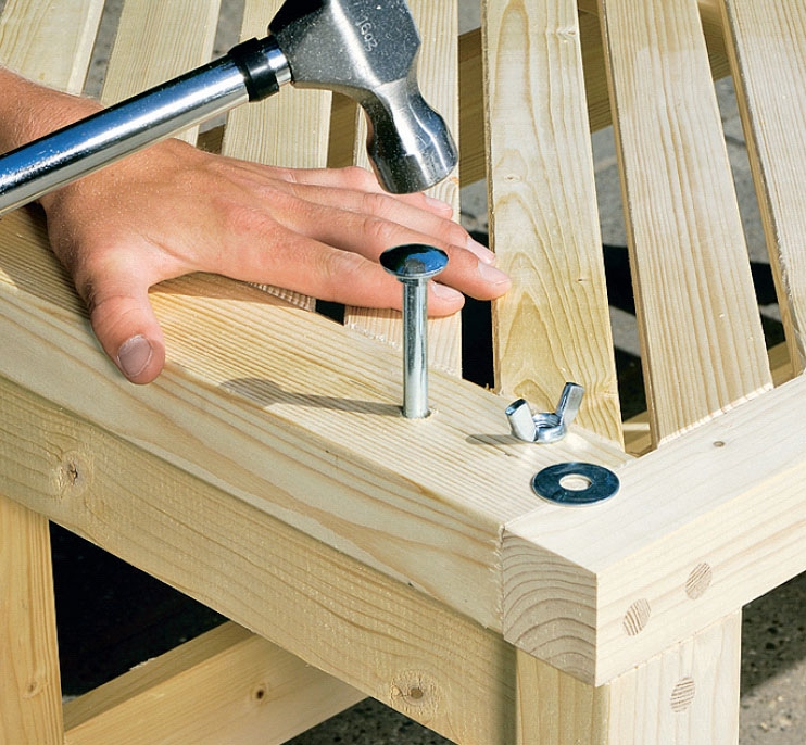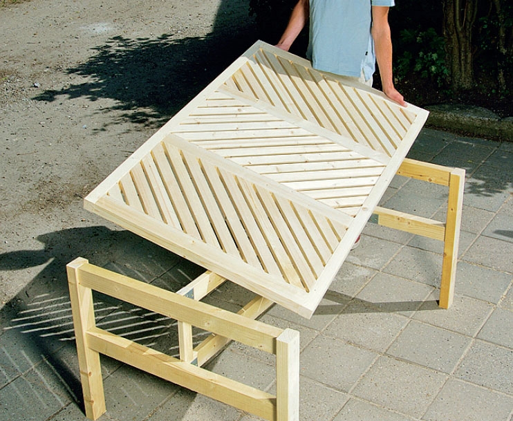 Bordsskivan, sitsen på bänken och underredena till både bord och bänk har konstruerats som ramar, som sätts ihop med kraftiga skruvar. Det innebär att du kan tillverka de ihopfällbara möblerna utan att behöva använda avancerade snickarfogar som t.ex. sinkning eller lax-stjärtfogar. Och för enkelhetens skull har samma konstruktion använts till alla delar. Det är faktiskt bara måtten som skiljer dem åt.