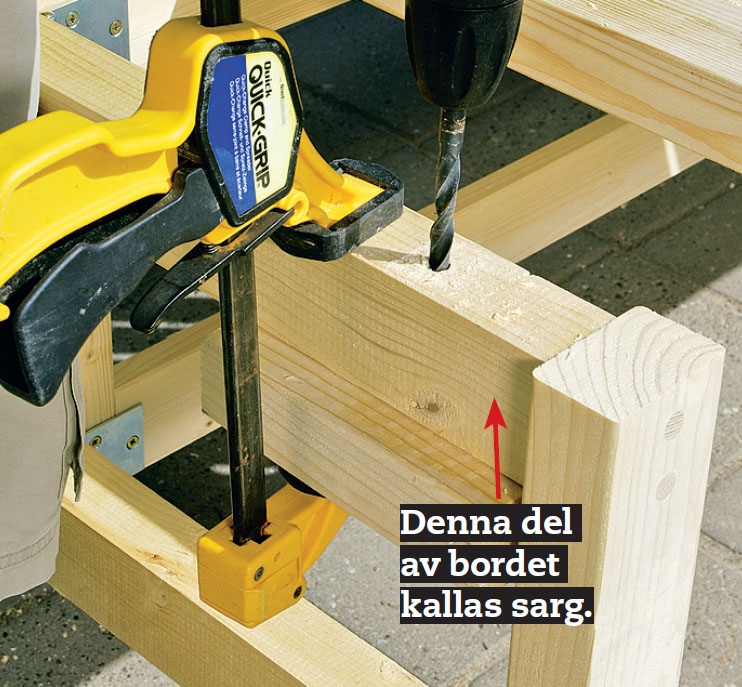 Lyft av bordsskivan och borra vidare ner genom sargen. Om du spänner fast en träkloss under sargen trasas den inte sönder när borren går igenom.