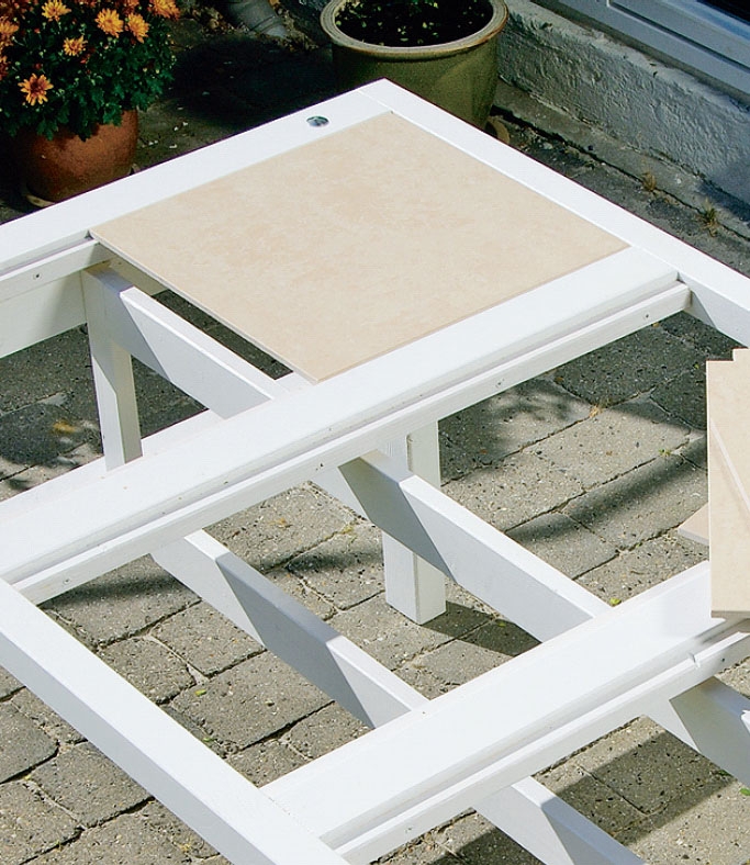 Ramarna i både bord och bänk fyller vi igen med 22 x 45 mm lister. De kapas i 45 grader i båda ändar, och då är det förstås bra att ha en kap- och geringssåg. Listerna placeras i fiskbensmönster. Du kan välja ett annat mönster om du hellre vill det. Och vill du inte använda lister kan du lägga stenplattor på 40 x 40 cm i ramarna. Det kan vara praktiskt om du vill sätta varma saker på bordet. Du kan också såga till plywood- eller mdf-skivor på 40 x 40 cm och lägga i ramarna.