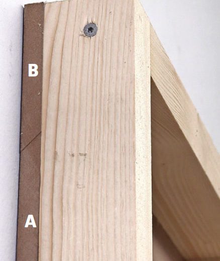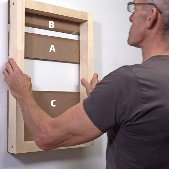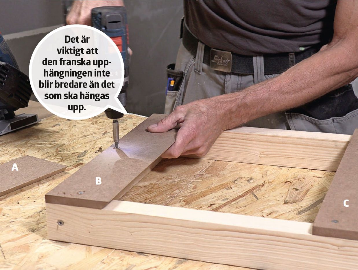 Skruva fast den ena av de snedsågade listerna (B) i möbeln och se till att vända den rätt, så att den kan hängas utanpå den andra listen (A) som skruvas fast i väggen. Genom att skruva fast en lika tjock list (C) nederst på möbeln får vi samma avstånd till väggen.