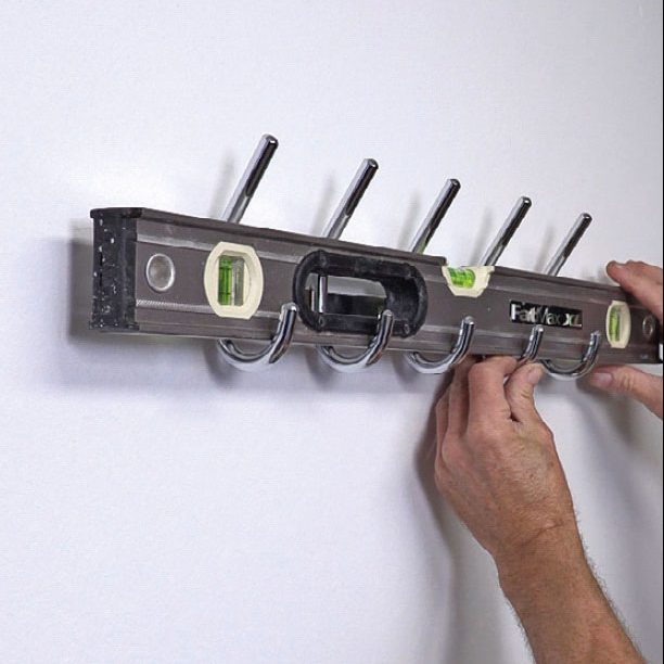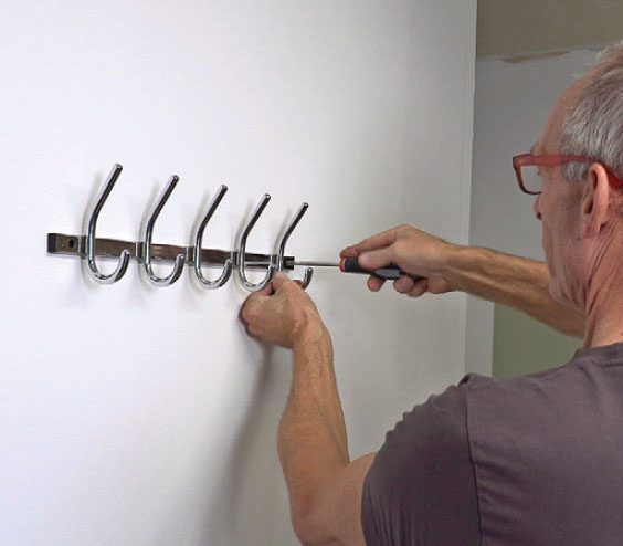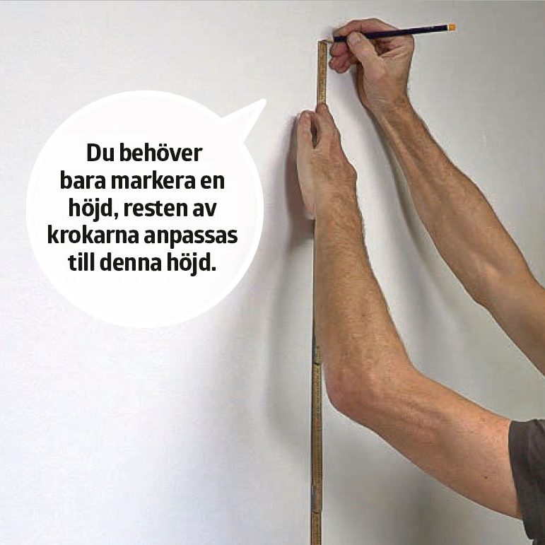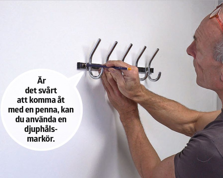 Ska du t ex hänga upp en kroklist, som kräver mer än en skruv, är tricket att sätta den ena skruven, hålla listen i våg och markera var det andra hålet ska sitta. Därefter är det bara att borra ett hål, sätta en plugg och skruva fast kroklisten.