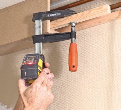 Hitta ett lämpligt ställe att placera din krysslaser. Du kan hänga den på en skruvtving, men en hög med böcker, en stol, en pall eller liknande går också bra.