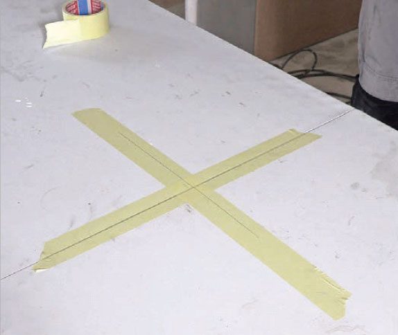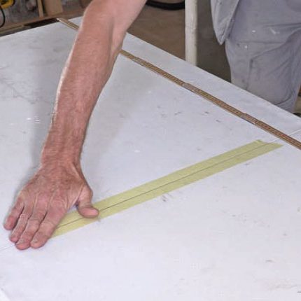 Mät upp halva bordets längd och sätt en bit maskeringstejp tvärs över bordet. Mät igen och markera halva bordets längd med ett blyertsstreck på maskeringstejpen.