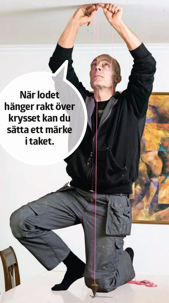 Upprepa processen, den här gången med bordets bredd. Sätt ett blyertsstreck så att du får ett kryss. Nu vet du var bordets centrum är och var centrum på lampan bör hänga.
