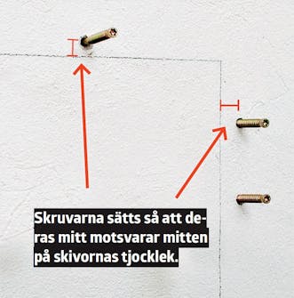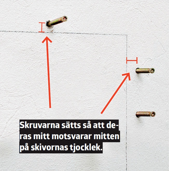 Här handlar det om en hylla av 40 mm tjocka skivor. Därför mäts 20 mm ut från strecket och markeras där skruvarna ska sitta. Därefter är det bara att borra hål och skruva i karmskruvarna.