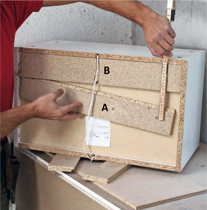 När man håller den nedersta listen (A) på plats bakom skåpet och mäter från kantens ovankant till underkanten på bärlisten (B), är det lätt att rita upp på väggen exakt var listen (A) ska sitta.