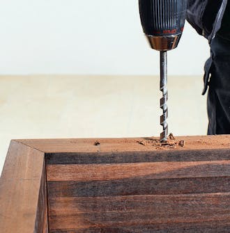 De huvudlösa skruvarnas placering förs noggrant över till träet och det borras hål som är lite djupare än så långt som skruvarna sticker ut från väggen. Då vet du att hyllan kommer ända in.